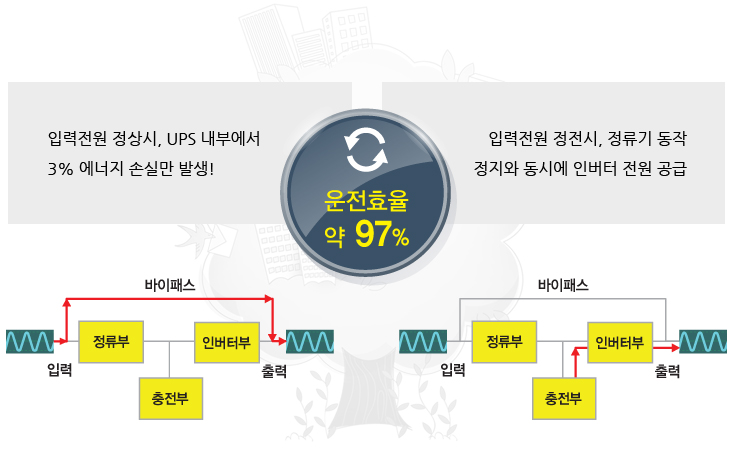 평상시 교류 입력전원(한전 전원)이 직접 전원 공급하고, 정전(비상)시 UPS 인버터가 자동으로 축전지 전원을 공급한다.
